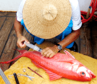 海底から急激に引き上げられた魚は、お腹に空気がたまって泳げなくなってしまいます(左下の写真)。注射器で空気を抜いて標識放流します。再捕されることを願って。(右下の写真)