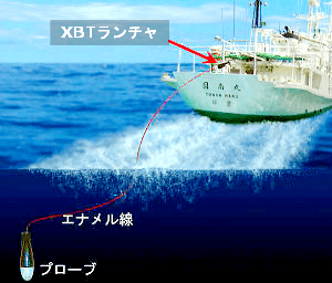 XBTは高速で航走中でも水温を測ることができる機械です。ランチャからプローブを海中へ投下し、水深760mまでを計測します。