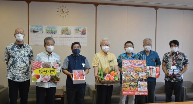 沖縄明治乳業株式会社では県産品奨励を目的として、「明治沖縄の味プレゼント」という消費者キャンペーンを実施しており、今年は新型コロナウィルス感染拡大の影響を受けている県産食材を応援するため、「新型コロナに負けるな!がんばろう沖縄!みんなで食べよう県産品」をスローガンに掲げ、賞品には県産の和牛、アグー豚、車エビや県産野菜・果実等の農林水産物が準備されています。