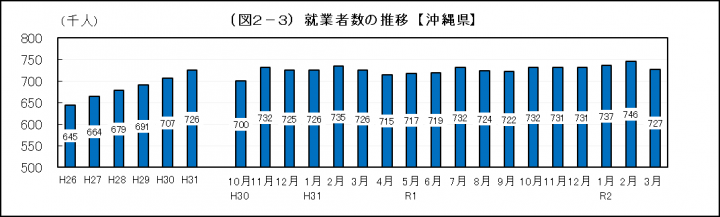- 就業者数は727千人と、前年同月(726千人)に比べ1千人増加し、4か月連続の増加となった。