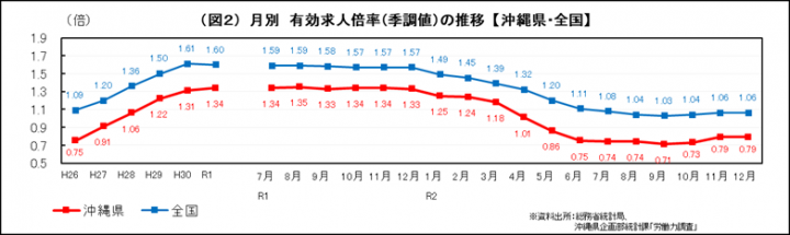 求人倍率の状況(全国:厚生労働省発表、沖縄県:沖縄労働局発表)