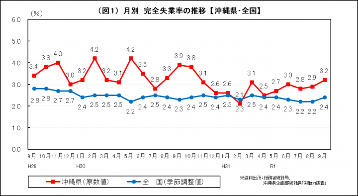 完全失業率の状況(出典:「労働力調査」/全国:総務省統計局、沖縄県:沖縄県企画部)