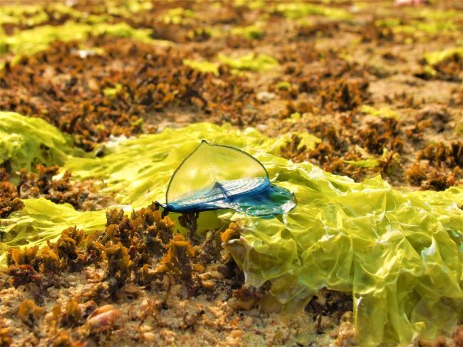 クラゲの仲間で、青い円盤のような形をしており、盤上に帆のような三角板をもっています。