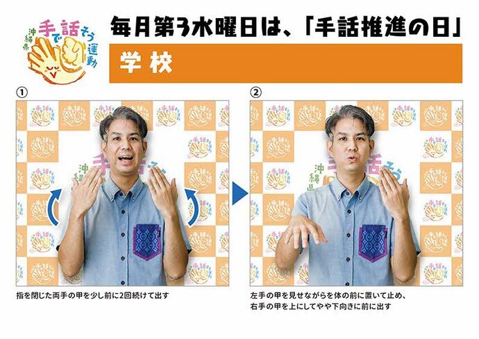 条例の基本理念にのっとり、県民の皆様に手話がより身近なものとなるよう、沖縄県聴覚障害者協会の協力のもと、毎月第3水曜日に、県のホームページを通じて、簡単な手話の表現をご紹介します。