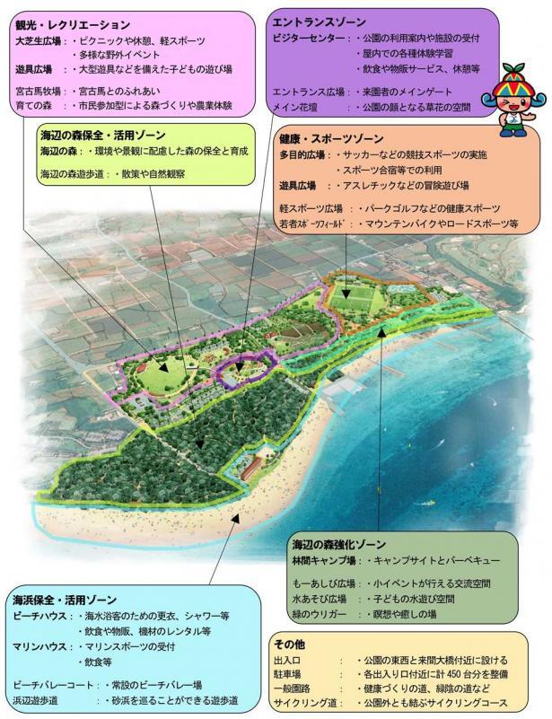 沖縄県では、平成24年5月に「沖縄21世紀ビジョン基本計画」を策定し、宮古圏域において「広域的レクリエーション需要に対応した広域公園の整備」の計画づくりに組んでいます。