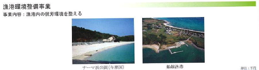 写真:漁港環境整備事業 事業内容 漁港内の就労環境を整える(左)ナーマ浜公園(与那国)(右)船越漁港