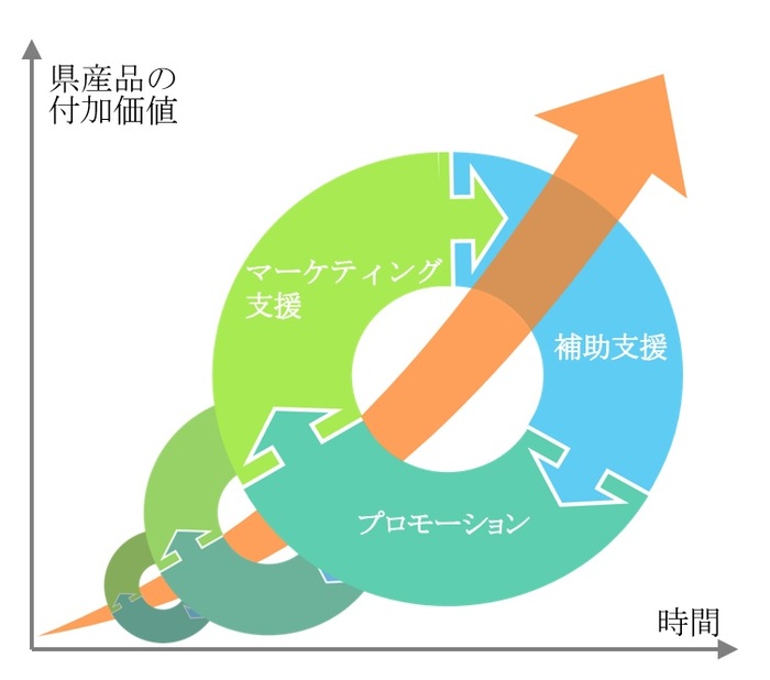 競争力のある付加価値の高い県産品の販路拡大を進めるためには、3つの事業の連携が重要となります。