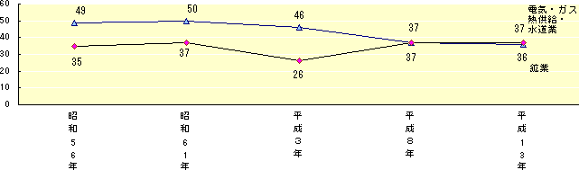 昭和56年以降の事業所数の推移をみると、「不動産業」、「サービス業」、「運輸・通信業」が上昇傾向にあるのに対し、「製造業」「卸売・小売業,飲食店」は低下傾向にある。また、「建設業」と「金融・保険業」は今回初めて減少した。