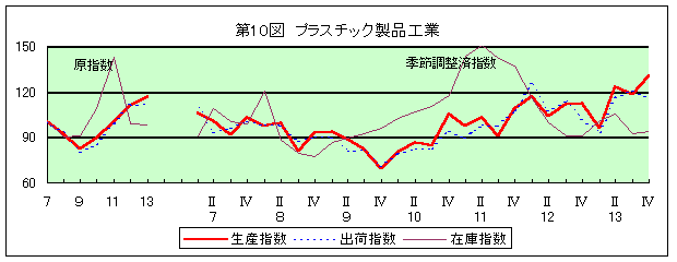 生産指数は、強化プラスチック製品の増加によって117.1となり、対前年比5.1%の上昇となった。出荷指数は、強化プラスチック製品の増加によって111.8となり、同0.2%の上昇となった。在庫指数は、強化プラスチック製品、発泡プラスチック製品の減少によって97.9となり、同0.7%の低下となった。