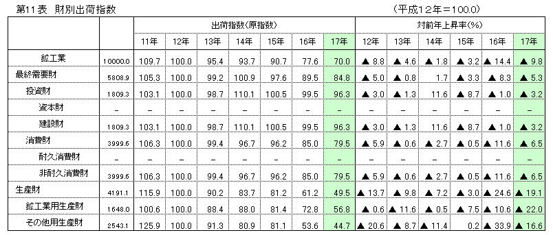 なお、財別の内訳では、建設財はアルミサッシ等、金網、小形棒鋼などが減少し、非耐久消費財はガソリン、精米、灯油などが減少した。また、鉱工業用生産