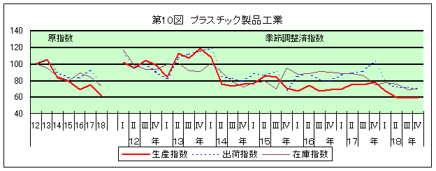 生産指数は、プラスチック製フィルム・シート、発泡プラスチック製品、プラスチックパイプなどの減少によって60.7となり、対前年比18.9%の減少と