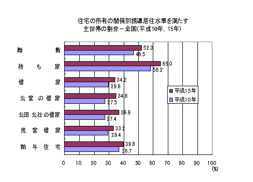 ○ 誘導居住水準以上の世帯総数の割合は、平成10年から平成15年で4.8ポイント上昇して42.1%となった。全国52.3%で、本県は10.2ポイント下回っている。